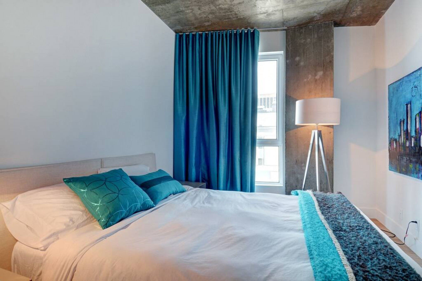 Chambre principale fermée avec lit " queen " et salle de bain attenante avec baignoire et douche intégrée;